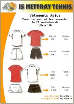 Rendez-vous le mercredi 28 Septembre 2011 de 15h à 19h au Moulin Maillet pour venir découvrir la gamme de vêtements Asics aux couleurs du club. Tee-shirts, polos, shorts, jupes seront présents. Seulement quelques tailles seront disponibles pour des essayages. Si vous êtes plus particulièrement intéressés par cette journée et que vous désirez avoir plus d’informations, ou bien si vous ne pourrez pas être présent à cette présentation mais que vous souhaiteriez tout de même découvrir les produits proposés, n’hésitez pas à contacter Marie-Pierre DÉTRÉ au 06 81 61 15 64.