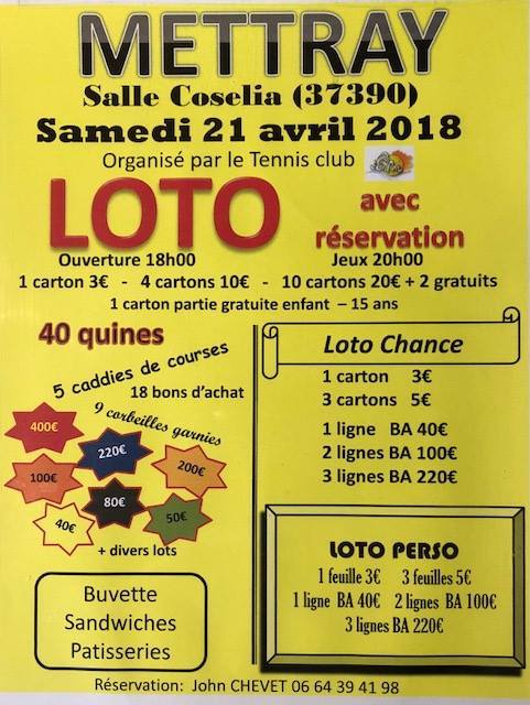 Super loto organisé par la JSMT le samedi 21 avril à la salle Coselia de Mettray, avec la collaboration de l'association mettrayenne l'Age d'Or.