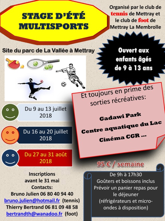 Stage multisports d'été organisé par le club de foot de Mettray-La Membrolle et le club de tennis de Mettray sur 2 semaines de juillet et 1 semaine d'août. Des sorties à Gadawi Park, au Centre aquatique du Lac et au cinéma CGR sont prévues !! Le stage n'est bien sûr pas réservé qu'aux enfants licenciés au foot et au tennis de Mettray, il est ouvert à tous les enfants âgés de 9 à 13 ans !!