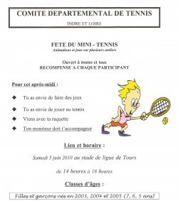Le Comité Départemental d'Indre-et-Loire de Tennis organise sa traditionnelle après-midi de mini-tennis le samedi 5 juin 2010, de 14 à 18 h. Tous les élèves de l'École de Tennis de Mettray nés en 2003, 2004 & 2005 sont invités à y participer. Des jeux de tennis et autour de tennis seront organisés toute l'après-midi. Un ou plusieurs enseignants de Mettray accompagneront les enfants. Pour des questions d'organisation, merci d'envoyer un mail à Florence (flo@defard.com) pour nous signaler votre participation (affichettes distribuées aux enfants en cours).