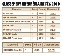 Honneur aux trois nouveaux classés du club : • Camille GUÉNIN & Grégory COLAS montent directement de NC à 30/5, merci le tournoi de Villedomer pour "Bag" et merci la Schmidlin pour "Grég" ; • Jean-Christophe DEMANESSE monte de NC à 40. 5 compétiteurs déjà classés montent d'un échelon : • Pierre-Yves SIZARET repasse de 30/2 à 30/1, normal après une perf à 15/4 ! • Louis RÉGLAIN retrouve son classement d'avant-Finlande : il est à nouveau 30/2 ; • idem pour Volny BLIN qui retrouve son classement à 30/3 après une perf à 30/1 à St-Pierre-des-Corps ; • Clément FOUGERET passe lui aussi à 30/3 après une perf à 30/2 au TCT • enfin, Paul DORIN passe de 40 à 30/5 grâce à un bon tournoi des Petits As également. Signalons que ce classement intermédiaire ne concerne que les 13 ans et plus... dommage pour l'ami Côme qui n'a pas encore 12 ans ! Répétons également que les résultats des Individuels n'ont pas été pris en compte pour ce calcul dans la mesure où ce Championnat ne s'achèvera qu'en mai 2010, date à laquelle les bonnes performances de Valy, Mathis, Bastien & Côme seront donc entrées dans l'ordinateur. Prochain classement intermédiaire : 7 juin 2010.