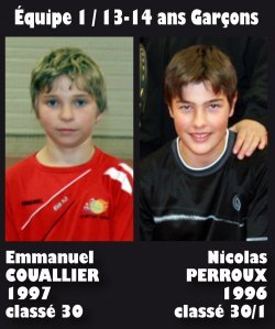 Ce dimanche a eu lieu une rencontre avancée du Championnat 13-14 ans Garçons. Signalons qu'étant donné leurs bons classements, Emmanuel Couallier (30) et Nicolas Perroux (30/1) ont hissé leur équipe en 1ère Division Départementale, ce qui n'était pas arrivé à une équipe de Mettray depuis les "fameuses" Biscarat et leur acolyte Charlène Vallet... Et pour cette première rencontre, les garçons ont battu Avoine sur le score de 2 à 1. Cf. le compte-rendu détaillé d'Olivier dans la rubrique "Février-Mars 2010". Merci aux supporters d'avoir été là ; RV le 06 mars pour la réception de l'équipe de St-Cyr.