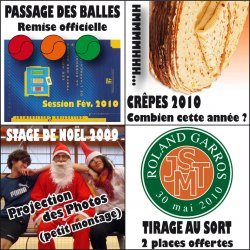 Samedi 27 février, 18 h 30, au Foyer rural... Nous commencerons par récompenser les 22 candidats* aux Balles Rouges et Oranges qui auront passé — et réussi — leurs tests l'après-midi. Nous visionnerons ensuite un petit montage des photos prises pendant le Stage de Noël (19-20-21 décembre 2009). Nous enchaînerons avec le tirage au sort de 2 places pour la journée du 30 mai à Roland-Garros : tirage au sort réservé aux licenciés de l'École de Tennis de plus de 10 ans (nés en 2000 et avant...), présents lors de la Soirée (inscription sur place). Il y aura également un petit concours qui récompensera celui ou celle (parent / enfant) qui aura trouvé le nombre exact de crêpes confectionnées ce jour-là : tee-shirt, casquette, poignet et porte-clés BABOLAT à gagner. Enfin, le Président — Patrice pour ne pas le nommer — et sa fidèle Mag vous proposeront le Premier Karaoké JSMT ; à ne pas louper. Inutile de dire que, pendant tout ce temps-là, les crêpes au nutella, à la confiture ou au sucre seront à dévorer... Pour une meilleure organisation de cette Soirée (18 h 30 à 20 h environ), merci à ceux et à celles qui voudront bien confectionner quelques crêpes de nous le signaler, en remplissant un petit bulletin et en le mettant dans l'urne prévue à cet effet, disposée devant le club-house ; simple indication (nous ne sommes pas à 2 crêpes près !) qui nous permettra de savoir le nombre de crêpes qu'il nous faudra faire, nous, les valeureux membres du Bureau ! Comme chaque année, nous tenons à préciser que cette Soirée n'est pas réservée aux seuls membres de l'École de Tennis, mais qu'elle est bien "ouverte" à tous les membres du club, leur famille et leurs amis. Qu'on se le dise ! * Liste des candidats au Passage de Balles du 27 février dans la rubrique "École de Tennis".