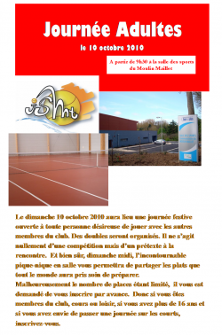 La Journée Adultes [et plus de 16 ans] aura lieu le dimanche 10 octobre 2010 à la salle du Moulin Maillet à partir de 9h30. Cette journée conviviale nous donnera la double occasion de découvrir les nouveaux visages et de retrouver les anciens... Matchs de doubles matin & après-midi, Winners & Loosers sur demande... Repas en commun organisé le midi : chacun pourra apporter un plat maison et le partagera avec les autres. Malheureusement, le nombre de places est limité pour une meilleure organisation et des temps de repos réduits. N'hésitez donc pas à vous inscrire dès maintenant... Inscriptions auprès de Nicolas par mail à nicomlerom@numericable.fr ou par téléphone au 02.36.70.64.99. (merci de bien préciser les noms et prénoms des participants) Vous savez ce qu'il vous reste à faire maintenant... Dépêchez-vous !!!