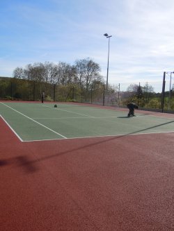 Eh oui, les 2 courts extérieurs au Moulin Maillet vont être très bientôt praticables. Les peintures sont faites et comme on peut le voir sur la photo, les lignes ont été relevées... Il ne manque plus que les filets ! (et 2-3 choses à configurer...) Encore un peu de patience et on pourra ainsi les réserver sur le site ballejaune.