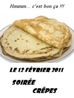 Rendez-vous samedi 12 février au foyer rural à partir de 18h30 pour la soirée crêpes. Tous les adhérents de la JSMT ainsi que les membres de leurs famille (parents, enfants) sont conviés à notre traditionnelle soirée qui sera l'occasion de se retrouver autour d'un bon verre (ou deux) de cidre et de crêpes confectionnées pas vos mains généreuses. L'an dernier, le record a été battu avec 502 crêpes !!! On en espère autant cette année... Sucre, confitures, Nutella et autres accompagnements seront déjà présents sur la tablée. La soirée sera également l'occasion d'évoquer de plus près Roland Garros 2011, de révéler le nom du gagnant des ventes de calendriers et pourquoi pas lancer le démarrage des inscriptions au Tournoi Interne Adultes 2011 (le fameux TIAM) ! Pour une meilleure organisation de cette soirée (18h30 à 20h environ), merci à ceux et à celles qui voudront bien confectionner quelques crêpes de nous le signaler, en remplissant un petit bulletin et en le mettant dans l'urne, disposée devant le club-house, ou en nous l'indiquant par mail à l'adresse suivante : oliviercochard@msn.com ; ceci n'étant qu'une simple indication (nous ne sommes pas à 2 crêpes près !) qui nous permettra de savoir le nombre de crêpes qu'il nous faudra faire, nous, les valeureux membres du Bureau ! De plus, cette année, il n'y a pas de passage intermédiaire de balles. Pour les jeunes joueurs qui le désirent, rendez-vous dès 14h au Moulin Maillet pour une après-midi jeux sous la responsabilité de Louis, Charlène et Olivier. Des winners, loosers notamment et peut-être quelques doubles seront organisés. Alors venez vous amuser sur les courts de tennis samedi après-midi les jeunes !!!
