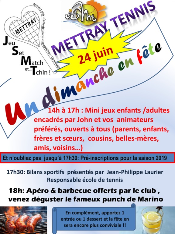 De 14h à 17h, enfants et adultes du club ainsi que leurs invités extérieurs au club pourront s'affronter lors de mini matchs de tennis dans une ambiance détendue. Sur ces mêmes horaires, vous aurez la possibilité de vous pré-inscrire au club pour la saison 2018-2019 (en déposant le dossier complet d'inscription correspondant, dont les documents sont disponibles sur ce site rubrique Infos pratiques, Documents administratifs 2018-2019).